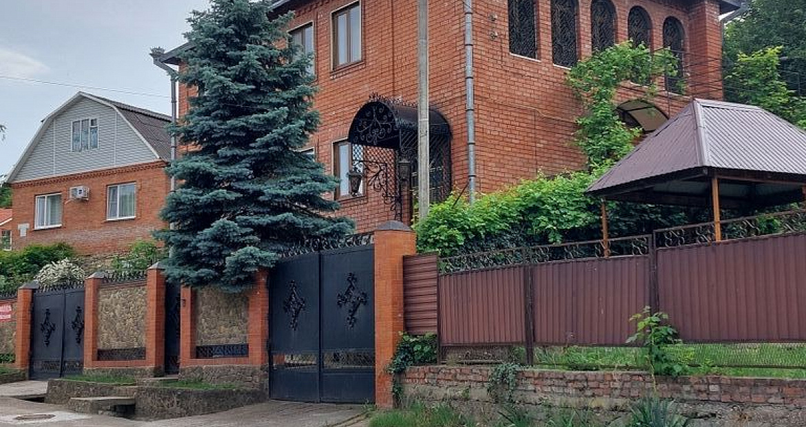 Материал стен из которых возведен дом – кирпич, территория двора ухоженная, забетонированы дорожки, посажено много зеленых растений.